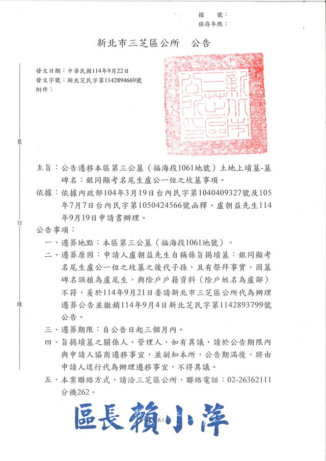- 遷葬原因:申請人盧朝益先生自稱係旨揭墳墓:銀同顯考名尾生盧公一位之坆墓之後代子孫,且有祭拜事實,因墓碑名誤植為盧尾生,與除戶戶籍資料(除戶姓名為盧鄙)不符,爰於114年9月21日委請新北市三芝區公所代為辦理遷葬公告並撤銷114年9月4日新北芝民字第1142893799號公告。