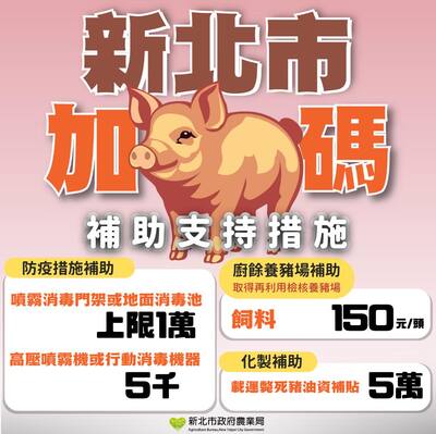 新北市政府除全力配合,更加碼補助、提供防疫設備補助,協助豬農穩定經營、豬肉供應平穩。