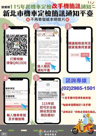 - 115年起「新北市機車排氣定檢」不再寄發紙本明信片,將全面改為 手機簡訊通知,只要輸入 機車車號 及 手機號碼 完成登錄,每年定檢時間到,簡訊主動提醒你,不怕忘、不怕被罰