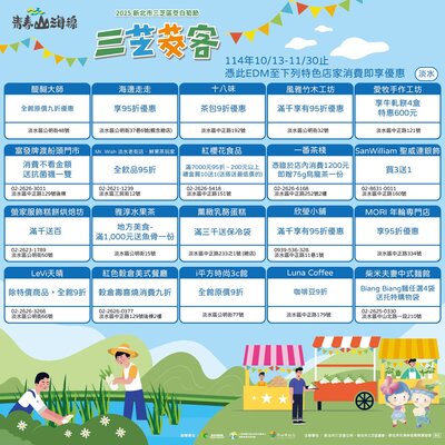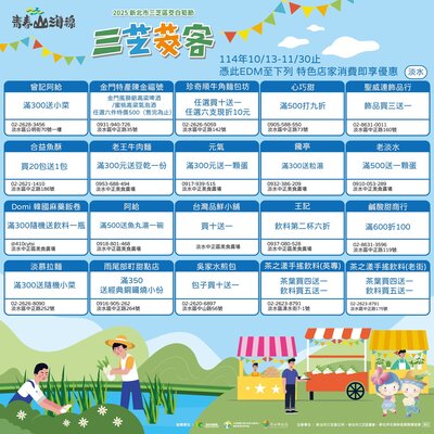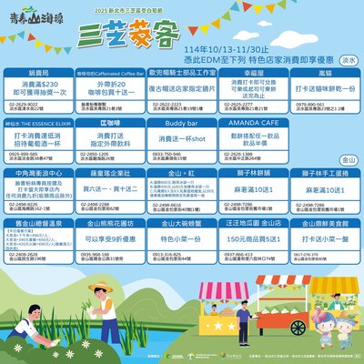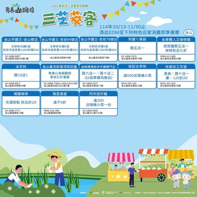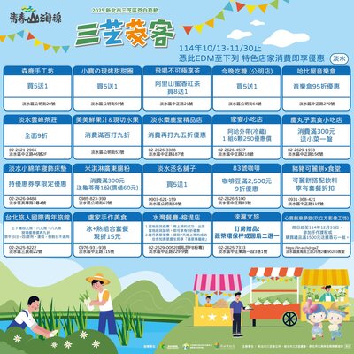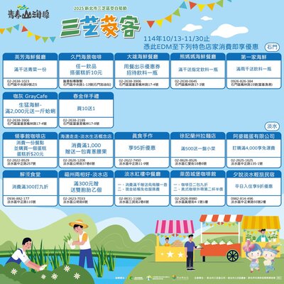 只要前往 淡水 三芝 石門 金山 青春山海線合作店家,出示本篇貼文EDM(如下圖)即可享有「店家限定優惠」好康多到滿出來~錯過真的會捶心肝
