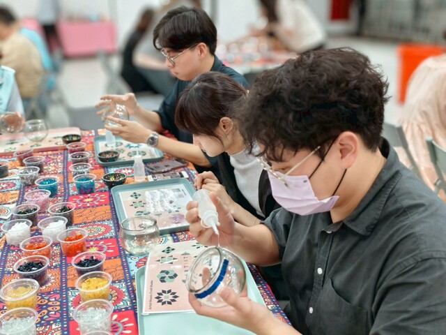 製作的過程更需要有足夠的耐心,同仁們隨著音樂節奏,專注地一片片拼貼出自己的作品,就像進入一場「藝術冥想」