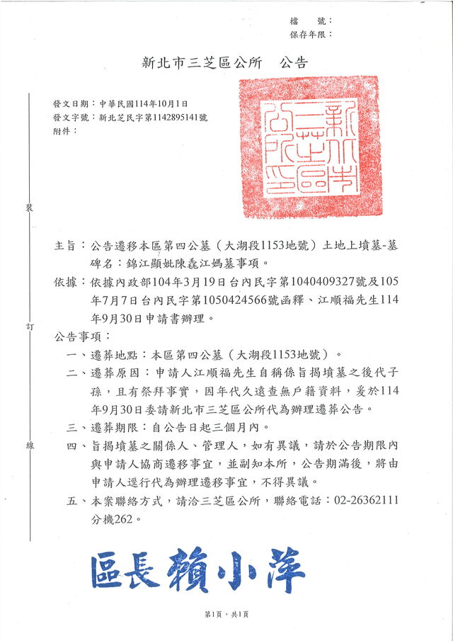 - 遷葬原因:申請人江順福先生自稱係旨揭墳墓之後代子孫,且有祭拜事實,因年代久遠查無戶籍資料,爰於114年9月30日委請新北市三芝區公所代為辦理遷葬公告。